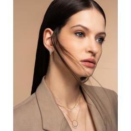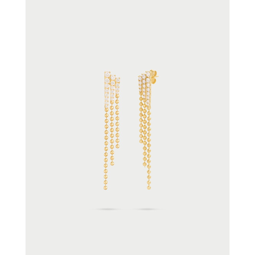 Questa coppia di orecchini è composta da tre catene di piccole sfere con tre lunghezze diverse, l'attacco ai lobi ha tre file di zirconi incastonate.