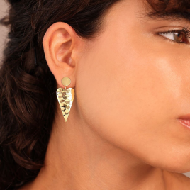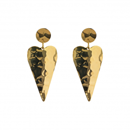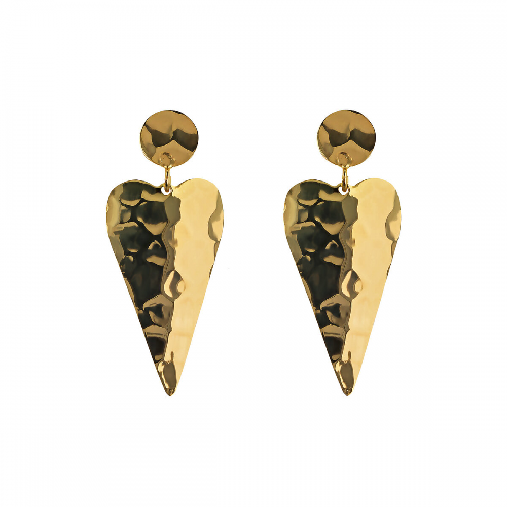Orecchini pendenti placcati oro giallo 18kt con cuori martellati pendenti e comoda chiusura a farfallina.