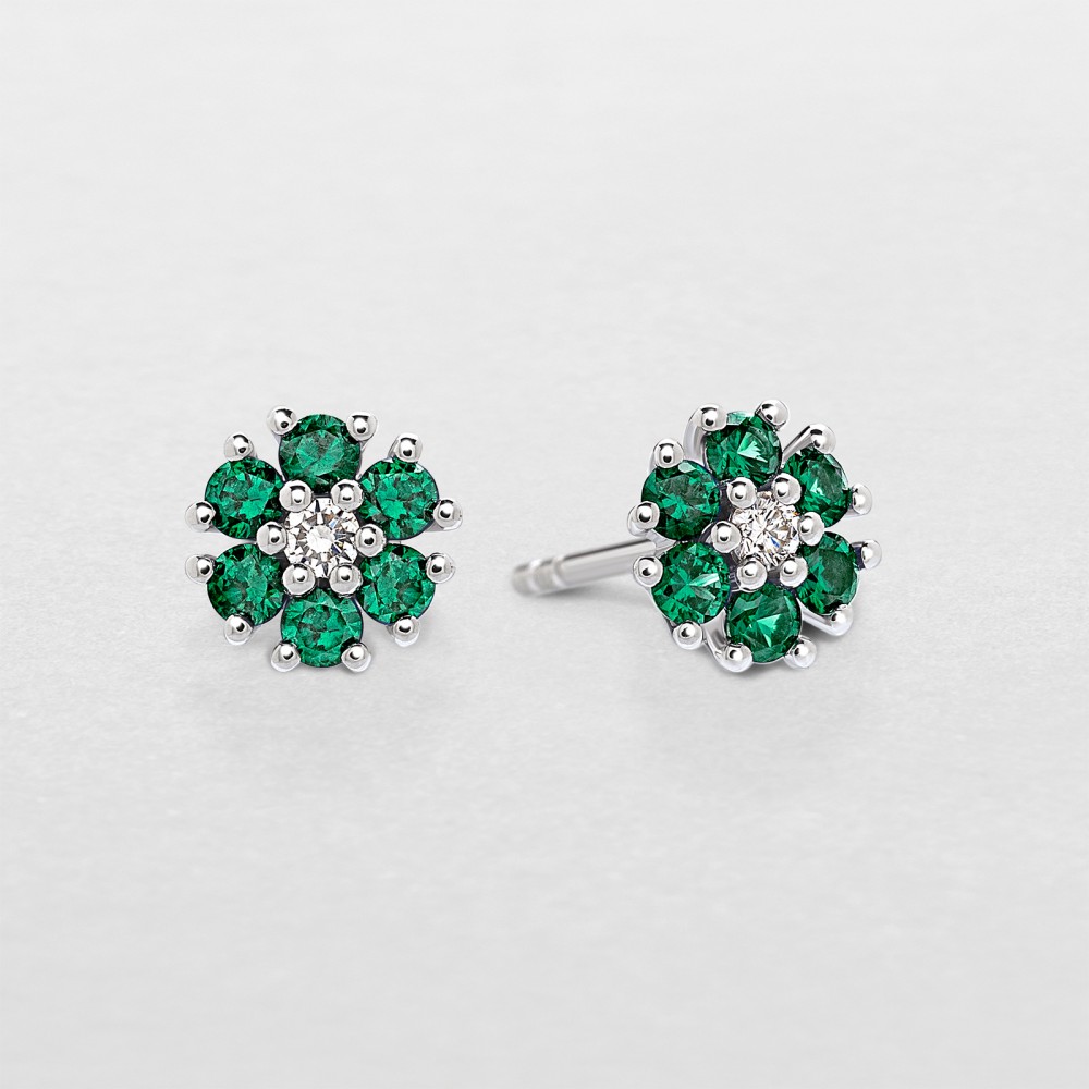 Orecchini a fiore in oro bianco 18kt con smeraldo e diamanti.